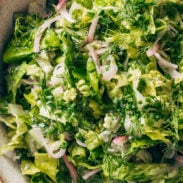 It is an A+ balance of crunchy and light and delicate – the herbs are ultra-fresh but not bossy, the pickled onions are there but not in your face, and the combination of finely chopped romaine (cronchy) with gently torn butter lettuce (tender) with the lightest, brightest vinaigrette slicked into to every nook and cranny is absolute salad perfection.