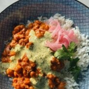 4. Serve: Serve the butter cauliflower on rice and top with the mint sauce. Add pickled onions if you want. ENJOY!