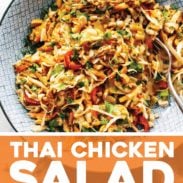 This simple chopped Thai chicken salad has BIG flavors – peanut, lime, soy, chili, cilantro. Topped with a homemade peanut dressing! Healthy and fresh.