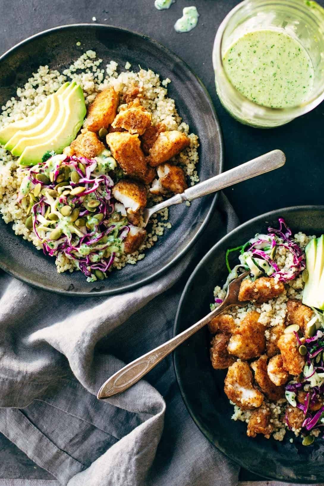 Crispy, fresh, and SO yummy! quinoa, slaw, avocado, and crispy fish!