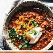 Chunky chili with cilantro, sour cream, and cheddar cheese in a rustic bowl.