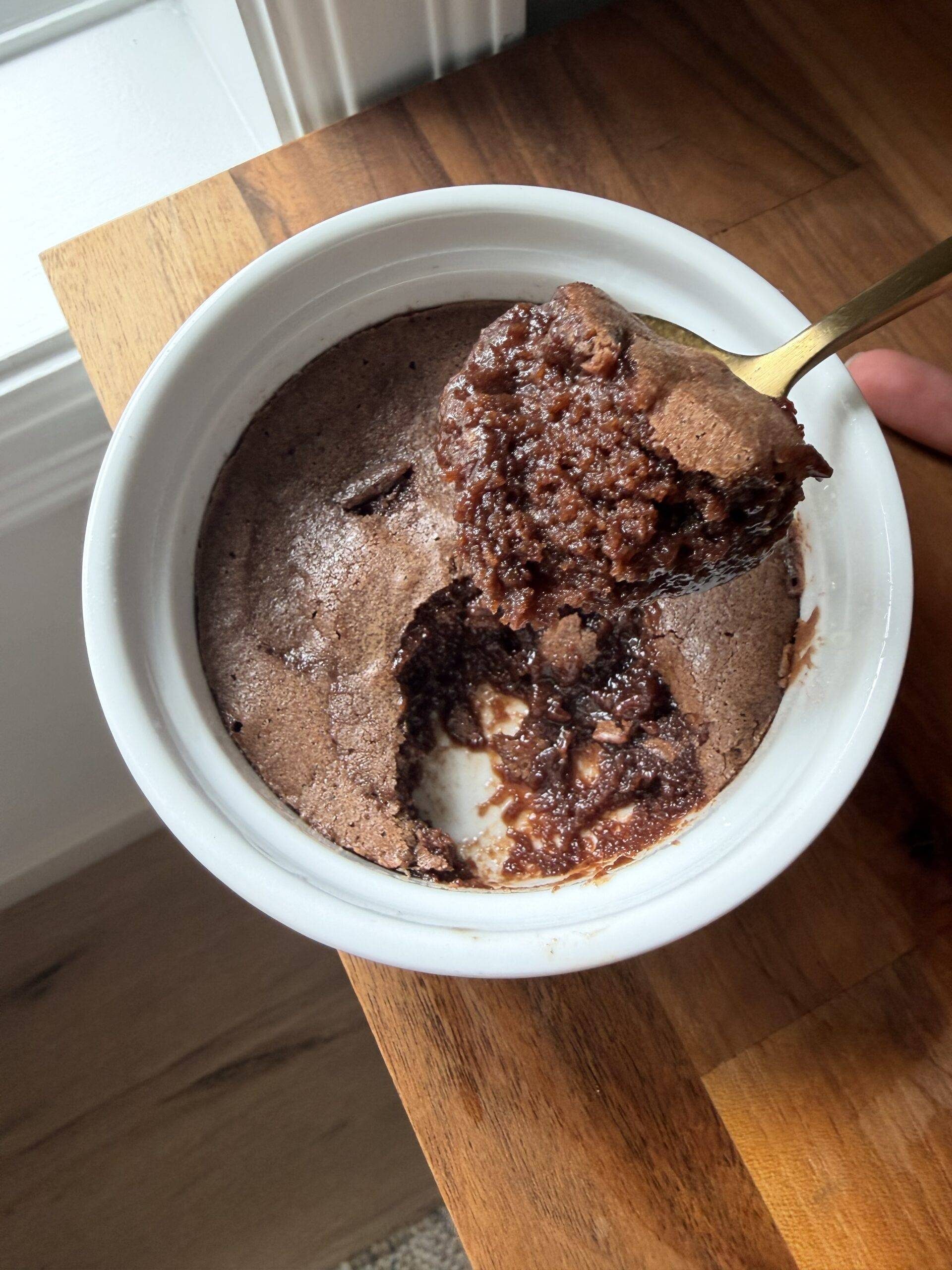 It was absolutely delicious! I had 6 slightly smaller ramekins so I doubled the recipes and filled them up about 2/3 full. They cooked for about 35 minutes but could have done a min or two less. I just kept watching and gently touching the top to make sure it was set. I didn’t know what to expect, but mine was a thin too crunchy/chewy level and the rest like hot brownie batter. Topped with whip cream. Yum!